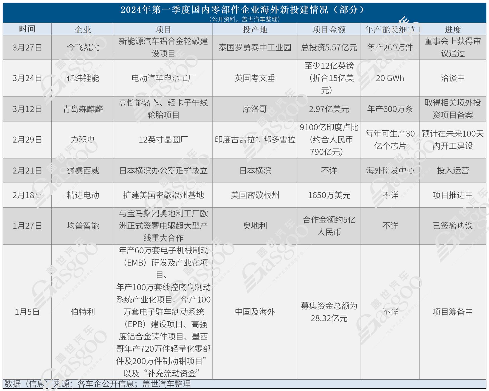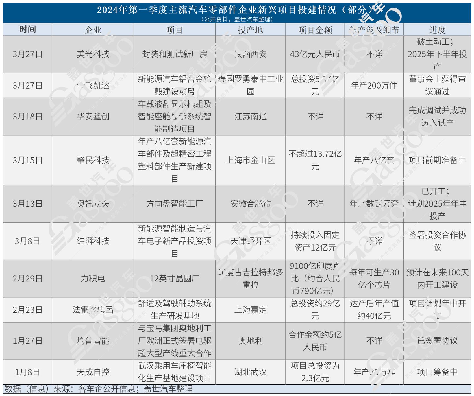 据极车视域不完全统计,2024年第一季度,至少有20家汽车零部件企业、25个新投建项目,其中包括新建工厂、扩建生产线、设立研发中心等等,涉及投资金额超1260亿元(部分企业项目并未公布投资额)。而在新投建的项目背后,是各家零部件企业对于市场的判断预期以及野心。