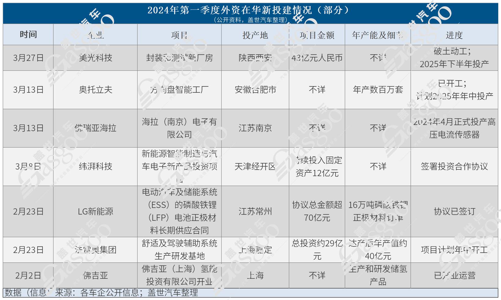 与采埃孚集团一道,不少外资零部件企业正不断加码中国市场,在中国市场投入真金白银,来巩固在中国市场的地位。根据极车视域不完全统计,今年第一季度中,累计超过7家外资企业在华投建新项目,其中包括法雷奥、奥托立夫、佛瑞亚海拉、纬湃科技、LG新能源、美光科技等头部零部件企业相继在华布产,整体投资金额超180亿元。