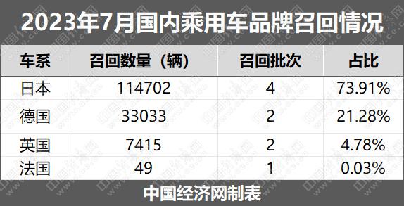 分国别和具体品牌来看,7月,日系4品牌共召回乘用车114702辆,占召回总量的73.91%,也是唯一召回数量超过10万辆的系别。其中,日产因“车辆ABS存在安全隐患”,而召回了83985辆全新劲客,成为7月召回之首,占当月召回总量过半,达54.11%。