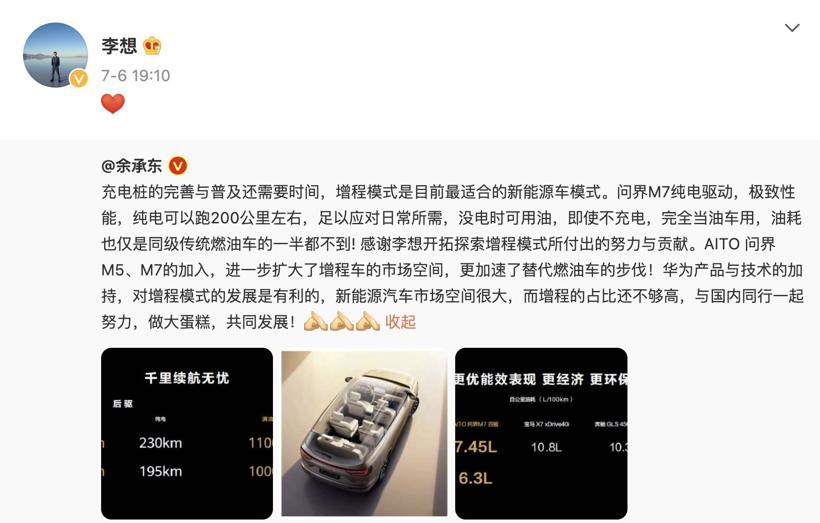 7月6日,余承东在微博发文为问界M7“站台”,不仅称“充电桩的完善与普及还需要时间,增程模式是目前最适合的新能源车模式”,还感谢“李想开拓探索增程模式所付出的努力与贡献”。