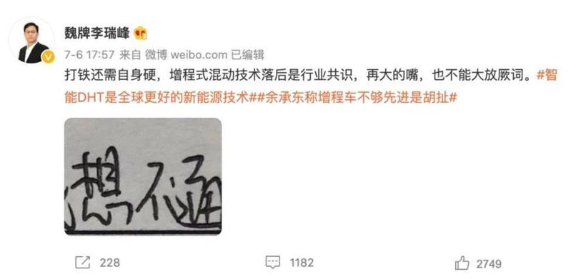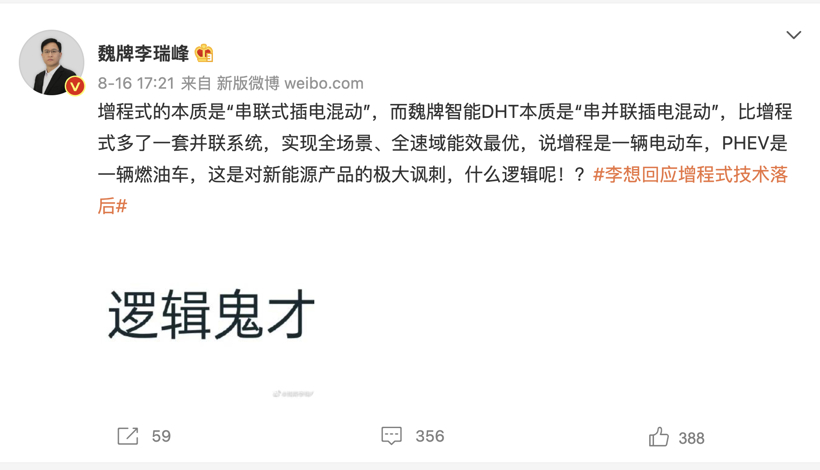 紧接着,魏牌汽车CEO李瑞峰在微博上发文“回怼”。他指出,增程式的本质是“串联式插电混动”,而魏牌智能DHT本质是“串并联插电混动”,比增程式多了一套并联系统,实现全场景、全速域能效最优,说增程是一辆电动车,PHEV是一辆燃油车,这是对新能源产品的极大讽刺,什么逻辑呢!