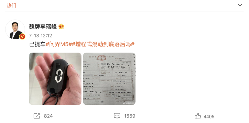 随后,李瑞峰晒出问界M5的车钥匙和购车发票,表示“已提车”,还配上话题“增程式混动到底落后吗”?