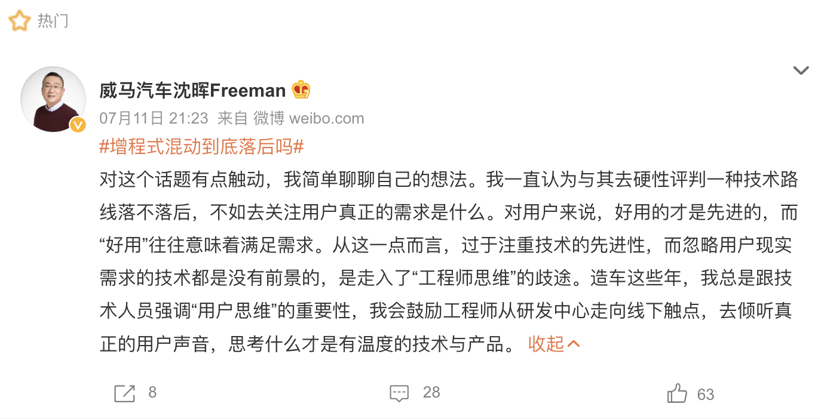 威马汽车创始人、董事长兼CEO沈晖也发表过观点:“与其去硬性评判一种技术路线落不落后,不如去关注用户真正的需求是什么。对用户来说,好用的才是先进的,而好用往往意味着满足需求。从这一点而言,过于注重技术的先进性,而忽略用户现实需求的技术都是没有前景的,是走入了工程师思维的歧途。”