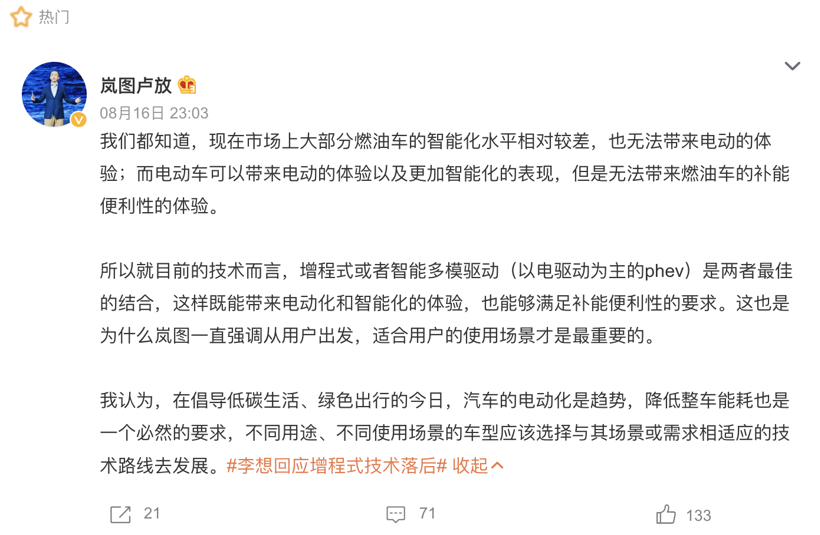 8月16日,岚图汽车CEO卢放发文称:“就目前的技术而言,增程式或者智能多模驱动(以电驱动为主的PHEV)是两者最佳的结合,这样既能带来电动化和智能化的体验,也能满足补能便利性的要求。”