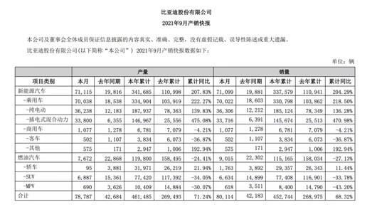 据比亚迪官方发布的最新数据显示,在刚刚过去的9月份,比亚迪乘用车的销量为79,037辆,同比增长93.2%,环比增长16.9%;其中新能源乘用车销售70,022辆,同比增长276.4%,占总销量的88.6%的份额,快速增长的新能源车已经成为了比亚迪市场表现的绝对主力。